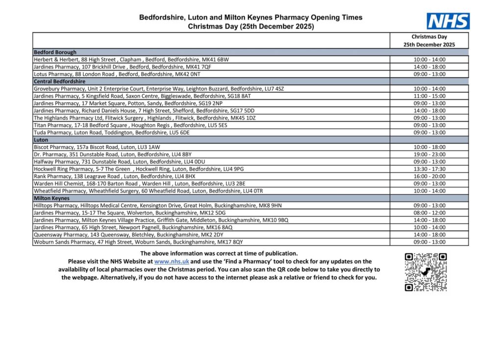 NHS England has published details of pharmacies that have been commissioned to open over the festive period across the East of England, including Bedfordshire, Luton and Milton Keynes, as well as neighbouring areas.